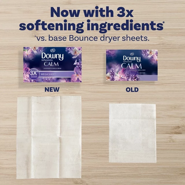 Deje que los relajantes aromas de lavanda y vainilla lo rodeen con Downy Infusions CALM, Lavender, Mega Dryer Sheets. Mega sábanas suaves. 80 unidades, proporcionan el triple de ingredientes suavizantes* para dejar tu ropa increíblemente suave y fresca, lo que la convierte en el toque final perfecto para tu rutina de lavado. Disfrute de menos estática y menos arrugas y más del aroma calmante que ama. Mete una sábana en tu secadora y experimenta frescura y suavidad duraderas. Infunda su rutina de lavado con aromas más calmantes con el suavizante de telas líquido Downy Infusions y las perlas potenciadoras de aroma para lavado Downy Infusions.*Vs. Marca líder en láminas para secadora base.