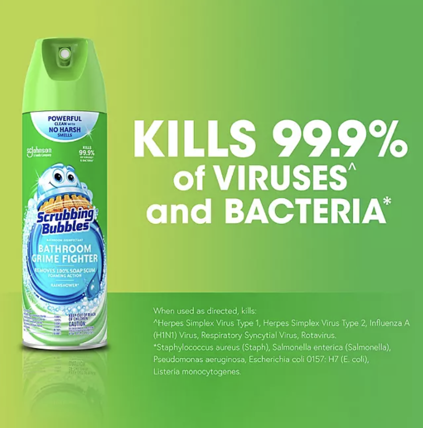 El aerosol Scrubbing Bubbles Bathroom Grime Fighter se puede usar en múltiples superficies y está especialmente formulado para la suciedad difícil del baño. Puede utilizar el limpiador de baño multisuperficie Scrubbing Bubbles en baldosas de cerámica vidriada, acero inoxidable, accesorios cromados, fibra de vidrio, vinilo, porcelana vidriada, vidrio, laminado, Corian, granito sellado y superficies de cuarzo. La espuma penetrante del limpiador de baños en espuma Scrubbing Bubbles limpia lugares de difícil acceso como bañeras, paredes de ducha, cortinas de vinilo para ducha, puertas de ducha, lavabos y encimeras.