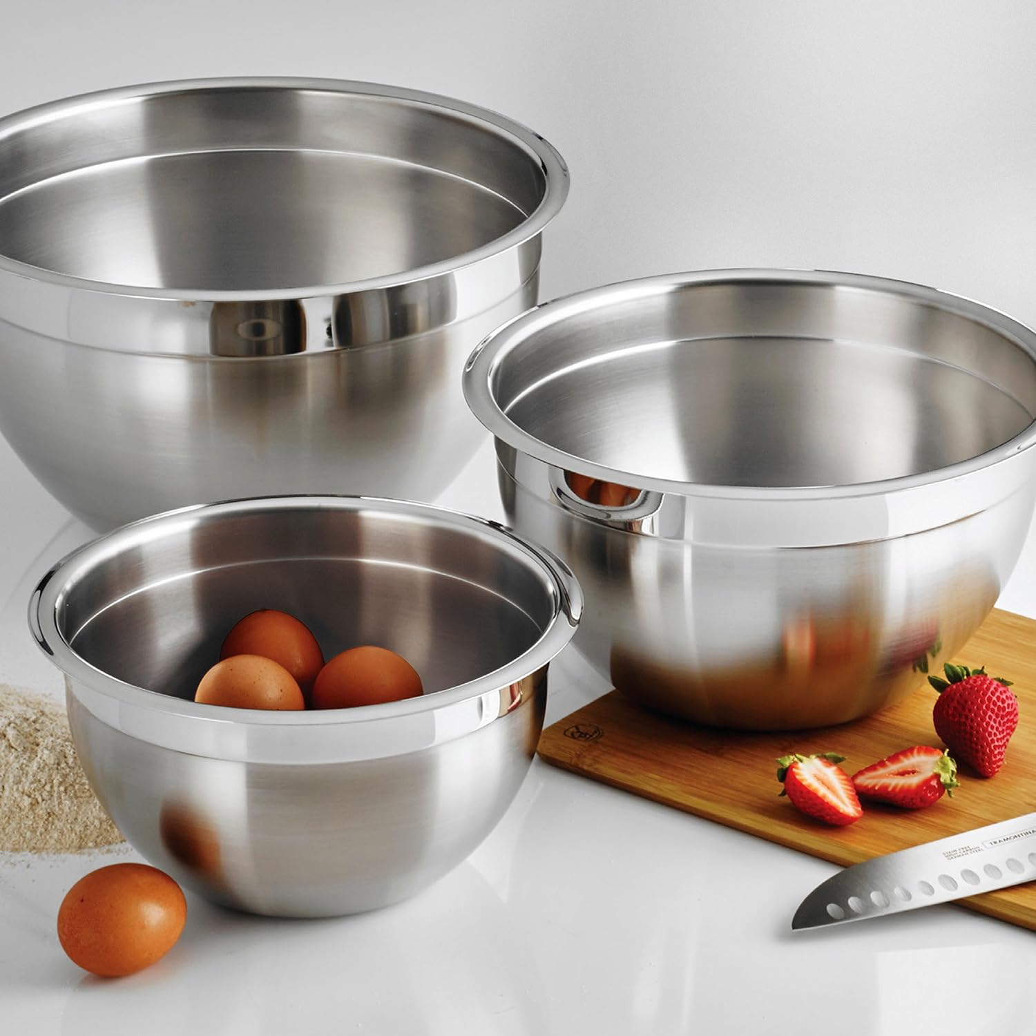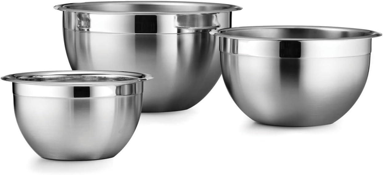 El juego de 3 piezas incluye: tazones para mezclar de acero inoxidable de 3 cuartos, 5 cuartos y 8 cuartos